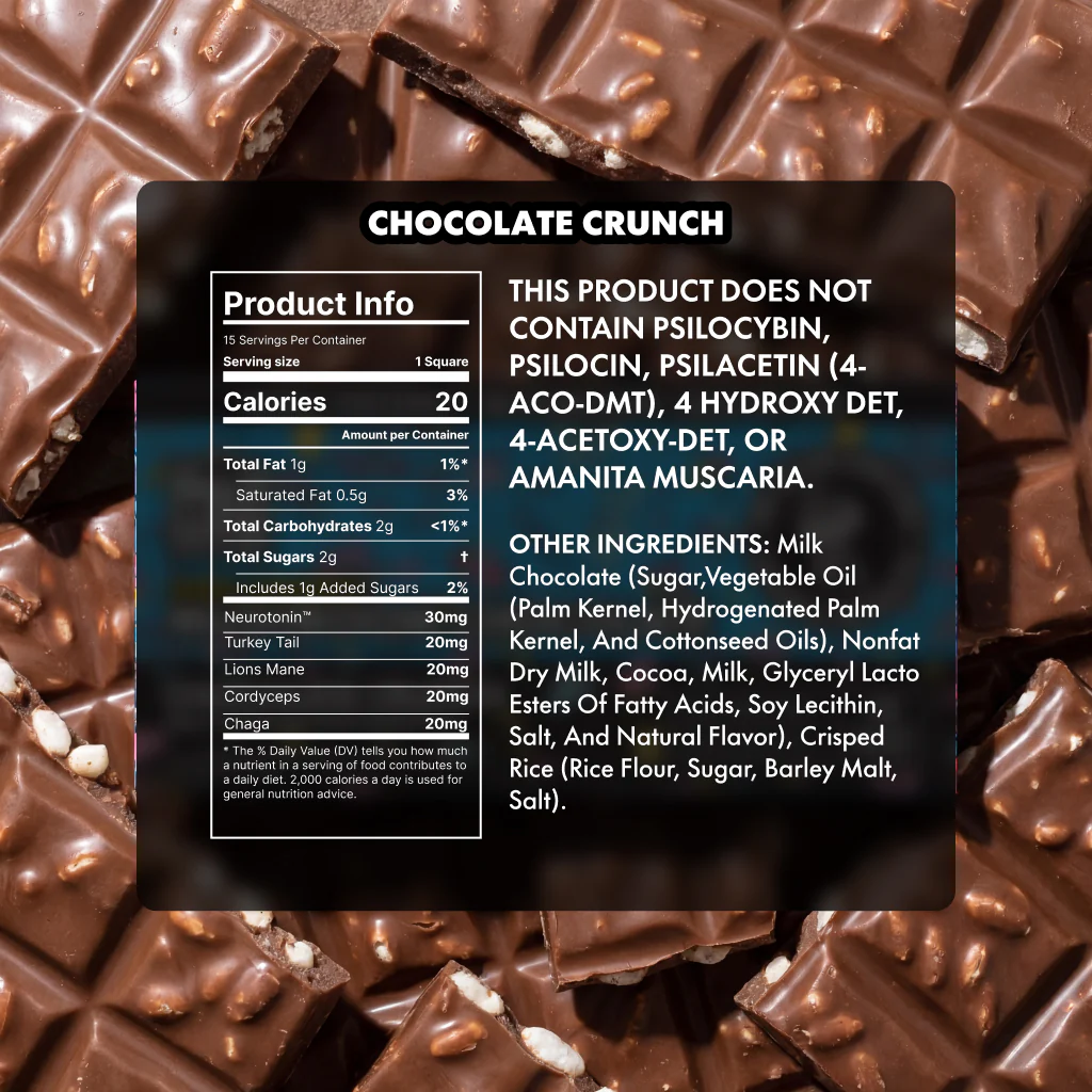 Our Chocolate Crunch Extra-Strength Mushroom Bar combines luscious milk chocolate with a crispy rice “crunch.”
