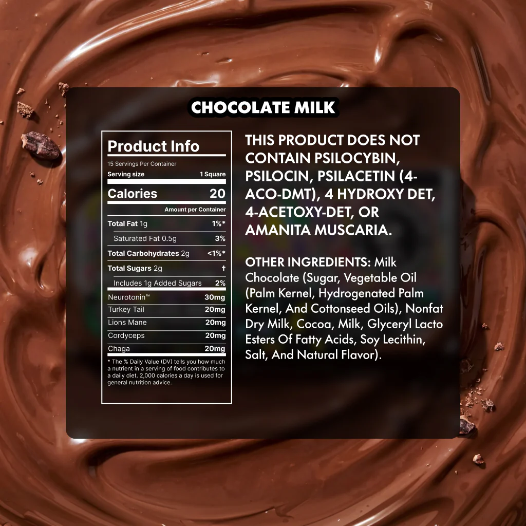 Our Chocolate Milk Extra-Strength Mushroom Bar delivers a groovy version of the classic milk chocolate bar.